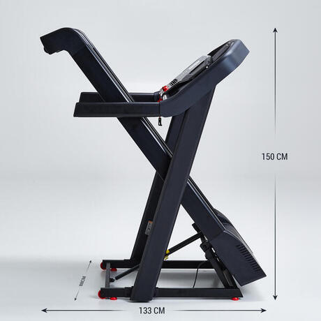 Le tapis T900 est pliable pour vous permettre de gagner de la place hors utilisation. En position pliée, la surface nécessaire au sol pour stocker votre tapis est de 133x88 cm.